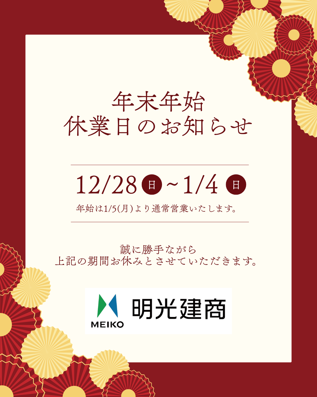 誠に勝手ながら12月28日(日)~1月4日(日)の期間お休みとさせていただきます。